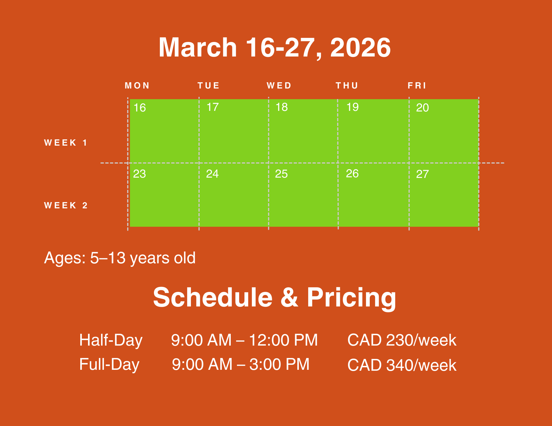 All materials are included, and the week concludes with an informal student art show for families. Perfect for families seeking spring art activities for kids, children’s art workshops, or an inspiring art camp near me during school holidays.